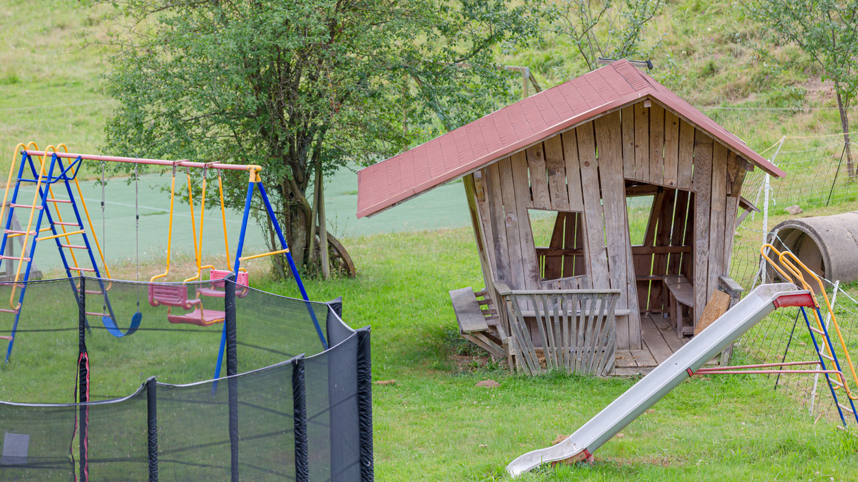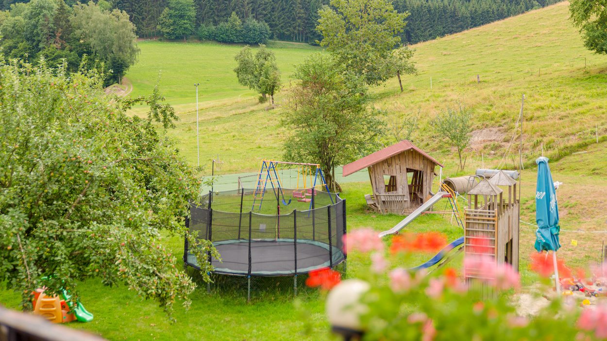 Ein großer Spielplatz mit Riesentrampolin, Ritterburg, Fußballtoren, überdachter Tischtennisplatte und Kinderspielhaus erwartet die Kleinen.