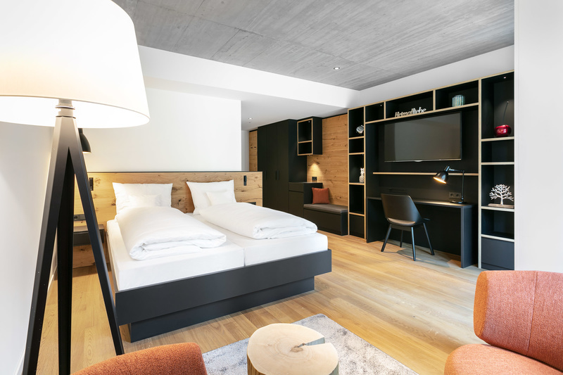 Alle Zimmer im Hotel Lauterbad sind im modernen Suiten Stil. Mit hochwertigen Materialien und viel Platz zum kuscheln, sind sie der perfekte Rückzugsort nach einem langen Tag.
