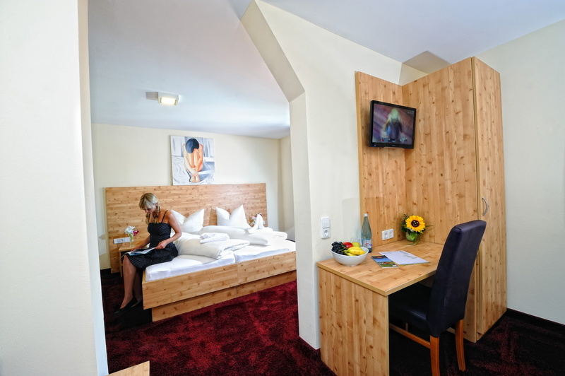 Die modernen Hotelzimmer sind im regionalen Stil gehalten. Wählen Sie zwischen Einzel-, Doppel- oder Herbergszimmer. Nur in den Herbergszimmern sind Hunde auf Anfrage erlaubt.