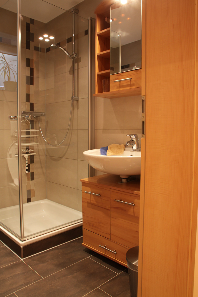 - Badezimmer, Dusche, WC, Handtuchheizung, Spiegelschrank und Fön