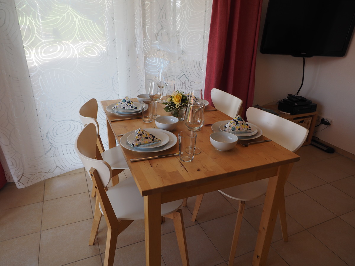 - Wohnzimmer mit Sitzecke, Esstisch, Spielecke (inkl. kleiner Auswahl an Büchern u. Spielen sowie Malsachen), Stereoanlage und CD’s, 2 Flachbild TV (Wohnzimmer, zusätzl. Schlafzimmer ->nur Typ C)